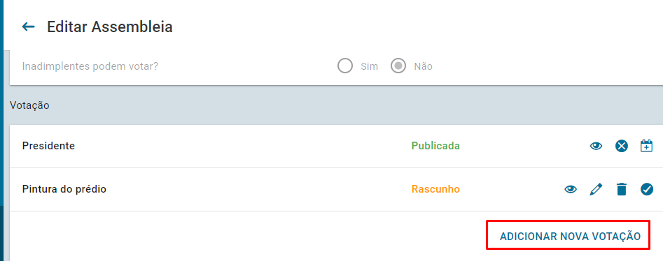 A partir da versão 1.9.299 do sistema, através da funcionalidade de assembleia, o administrador/síndico poderá incluir mais de uma votação durante a realização da assembleia.