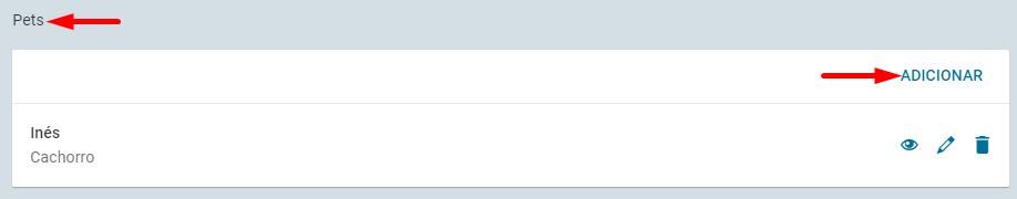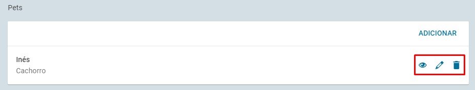 Através dos ícones localizados ao lado do pet cadastrado é possível: