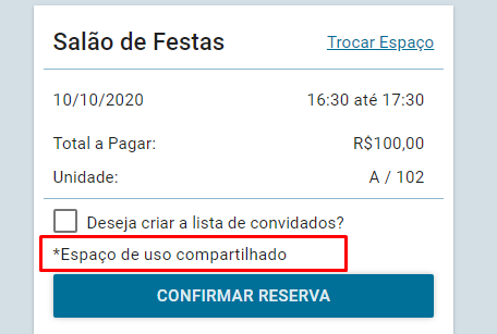 A tela de confirmação da reserva exibe a informação de que o espaço é de uso compartilhado.